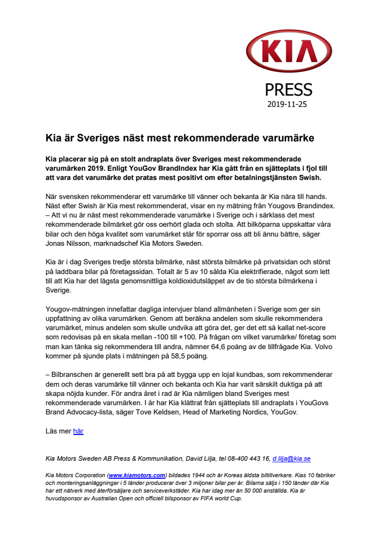 Kia placerar sig på en stolt andraplats över Sveriges mest rekommenderade varumärken 2019 i YouGov BrandIndex.