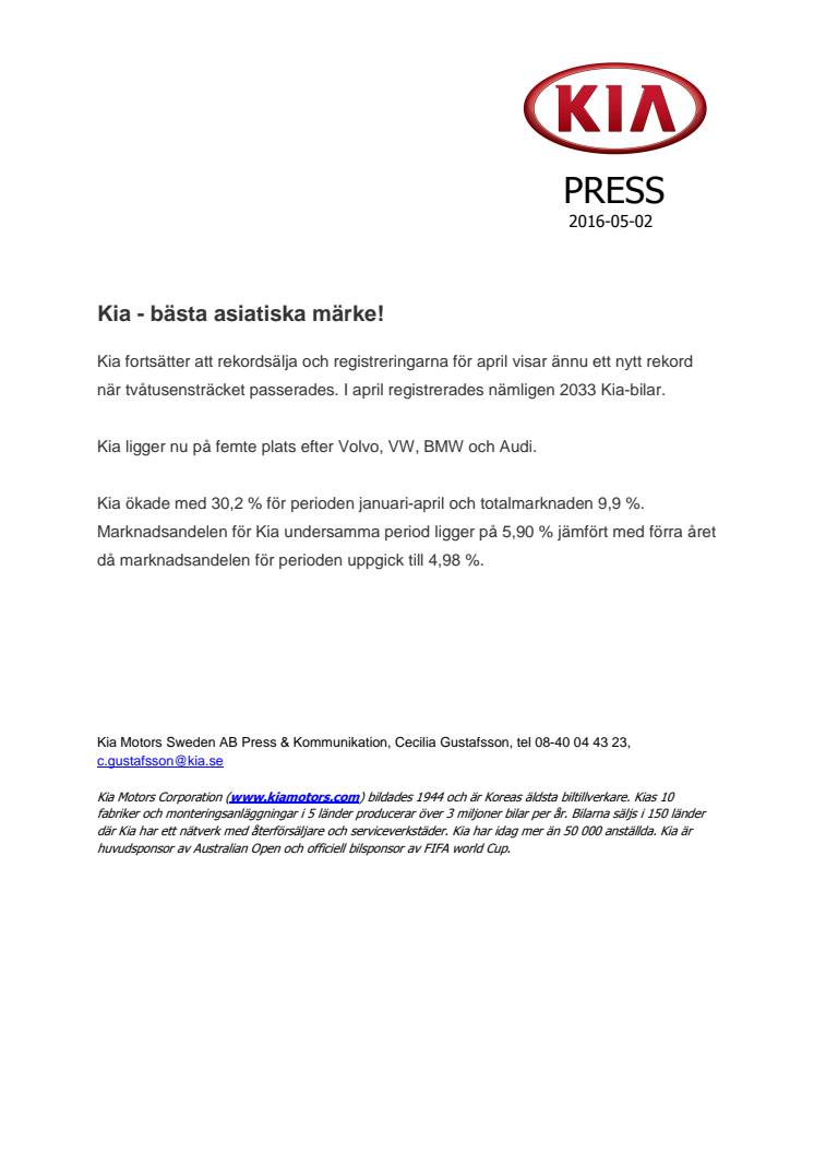 Kia fortsätter att rekordsälja och registreringarna för april visar ännu ett nytt rekord när tvåtusensträcket passerades. I april registrerades nämligen 2033 Kia-bilar.
