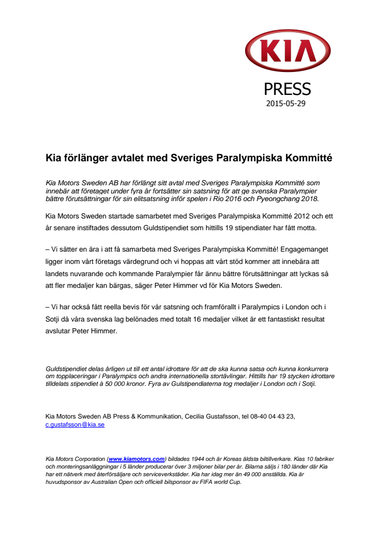 Kia Motors Sweden AB har förlängt sitt avtal med Sveriges Paralympiska Kommitté som innebär att företaget under fyra år fortsätter sin satsning för att ge svenska Paralympier bättre förutsättningar för sin elitsatsning inför spelen i Rio 2016 och Pyeongchang 2018.