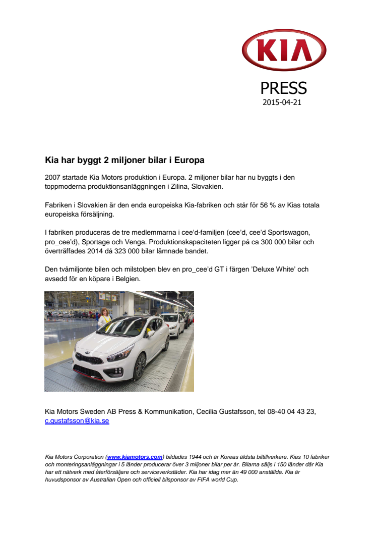 2007 startade Kia Motors produktion i Europa. 2 miljoner bilar har nu byggts i den toppmoderna produktionsanläggningen i Zilina, Slovakien.