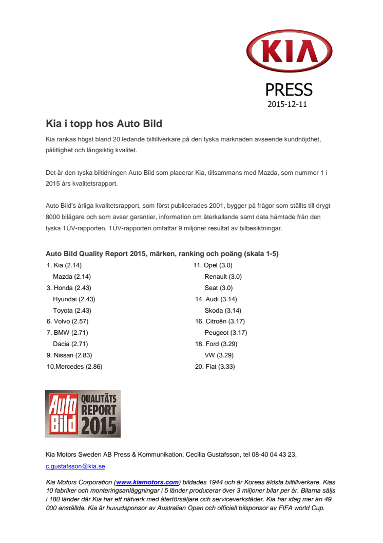 Kia rankas högst bland 20 ledande biltillverkare på den tyska marknaden avseende kundnöjdhet, pålitlighet och långsiktig kvalitet.