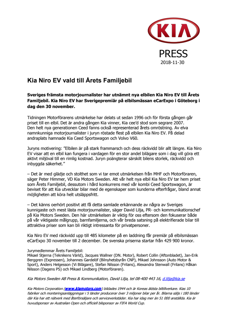 Sveriges främsta motorjournalister har utnämnt nya elbilen Kia Niro EV till Årets Familjebil.