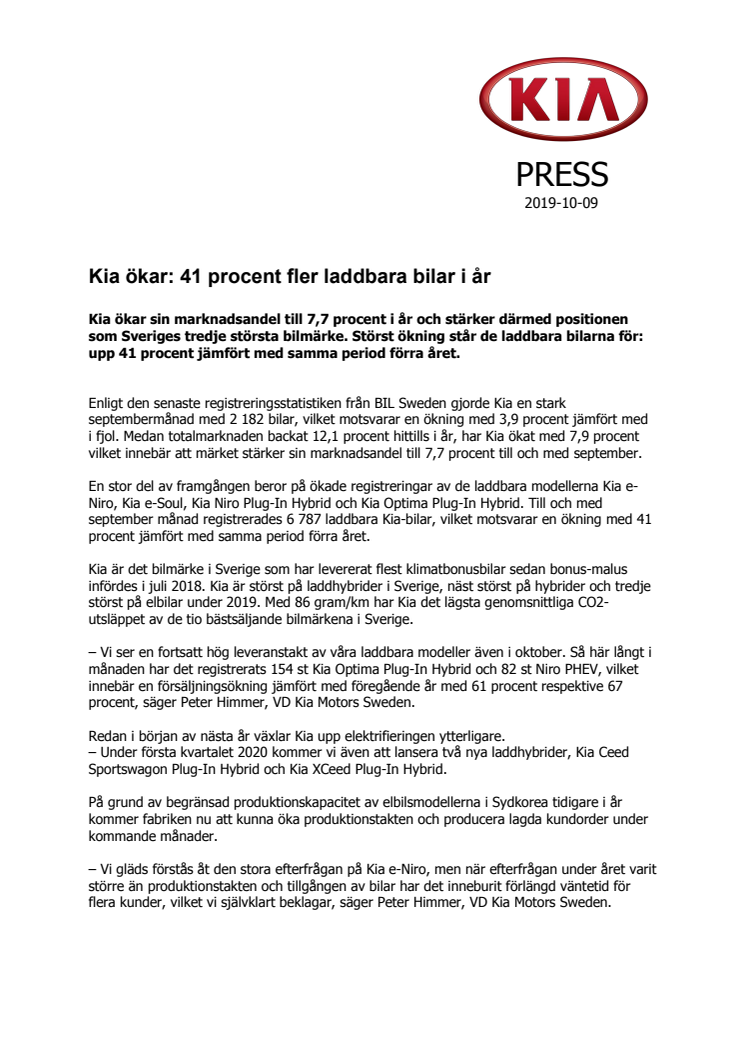 Kia ökar sin marknadsandel till 7,7 procent i år. Störst ökning står de laddbara modellerna för: upp 41 procent jämfört med samma period förra året.