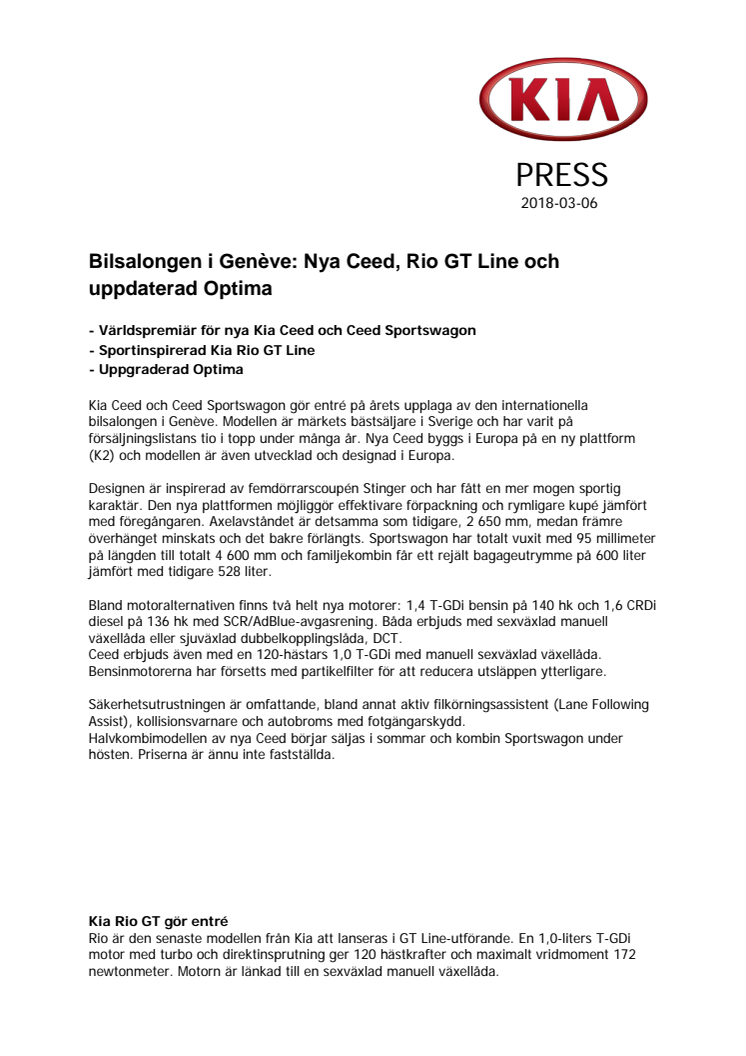 Kia presenterar flera spännande nyheter på bilsalongen i Genève: Världspremiär för nya Kia Ceed och Ceed Sportswagon - Sportinspirerad Kia Rio GT Line - Uppgraderad Optima.