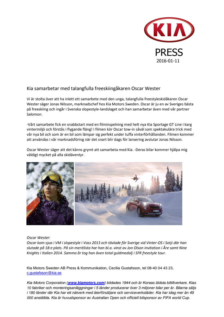 Vi är stolta över att ha inlett ett samarbete med den unga, talangfulla freestyleskidåkaren Oscar Wester säger Jonas Nilsson, marknadschef hos Kia Motors Sweden. Oscar är ju en av Sveriges bästa på freeskiing och ingår i Svenska slopestyle-landslaget och han samarbetar även med vår partner Salomon.