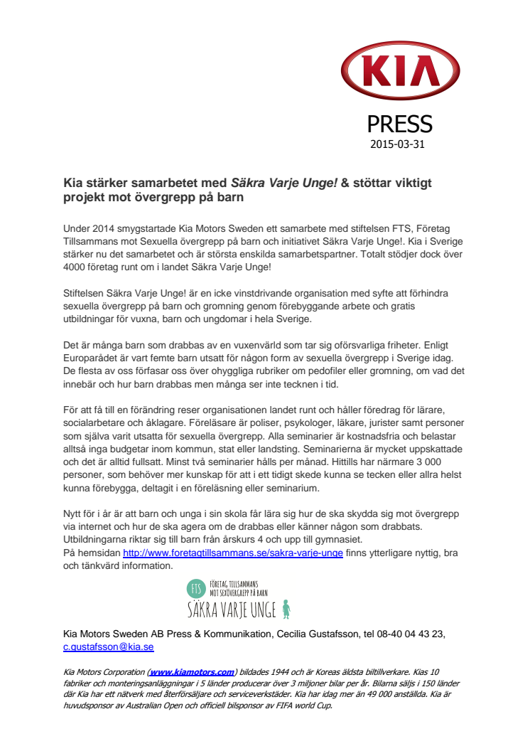 Under 2014 smygstartade Kia Motors Sweden ett samarbete med stiftelsen FTS, Företag Tillsammans mot Sexuella övergrepp på barn och initiativet Säkra Varje Unge!. Kia i Sverige stärker nu det samarbetet och är största enskilda samarbetspartner. Totalt stödjer dock över 4000 företag runt om i landet Säkra Varje Unge!