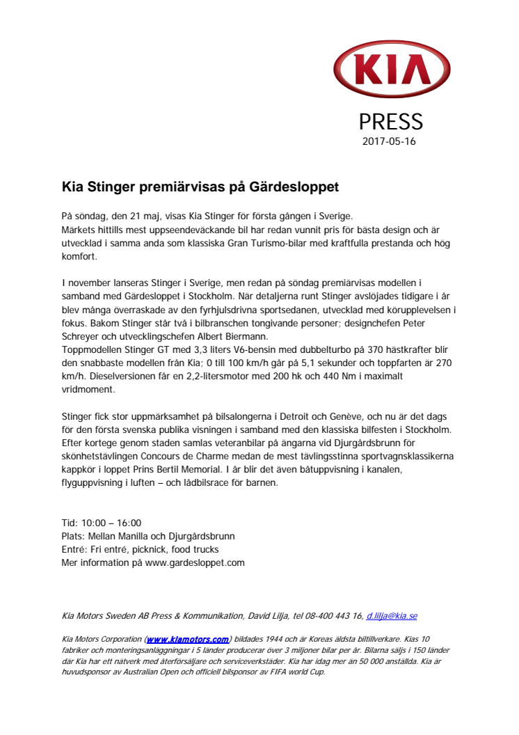 På söndag, den 21 maj, visas Kia Stinger för första gången i Sverige i samband med Gärdesloppet i Stockholm.