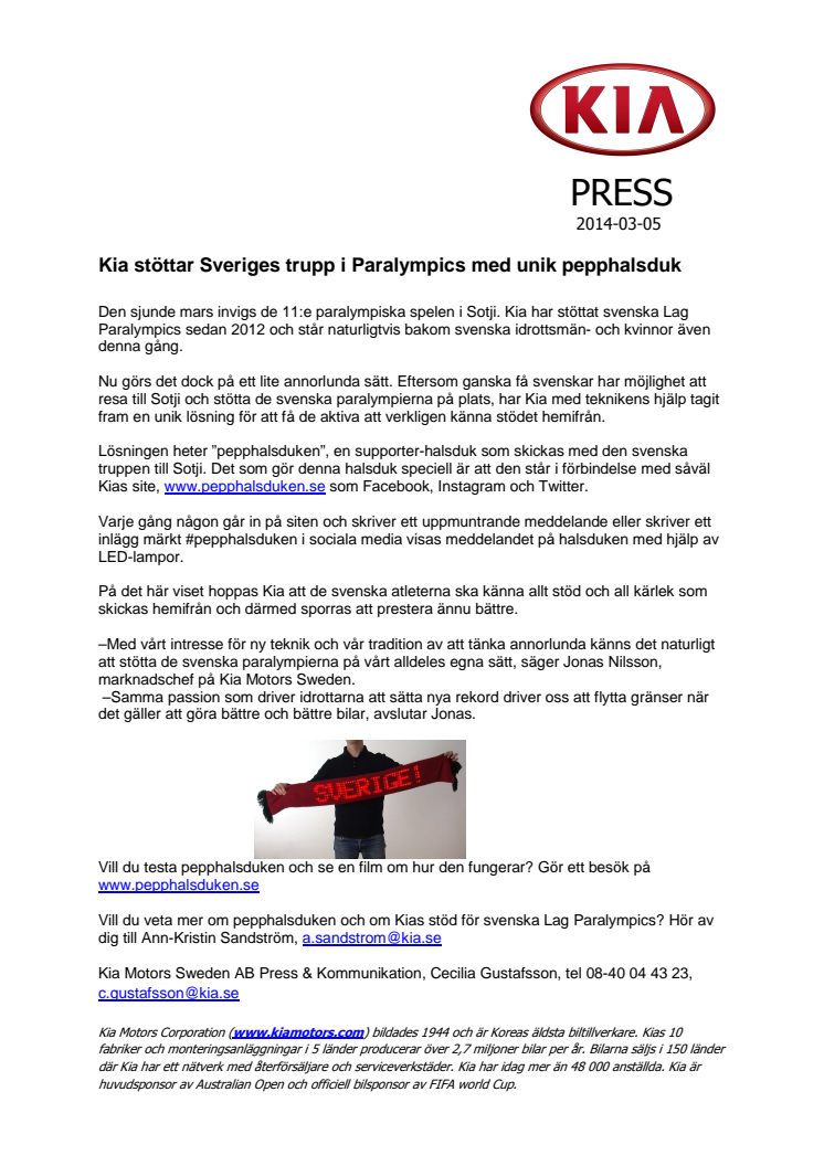 Kia stöttar Sveriges trupp i Paralympics med unik pepphalsduk
