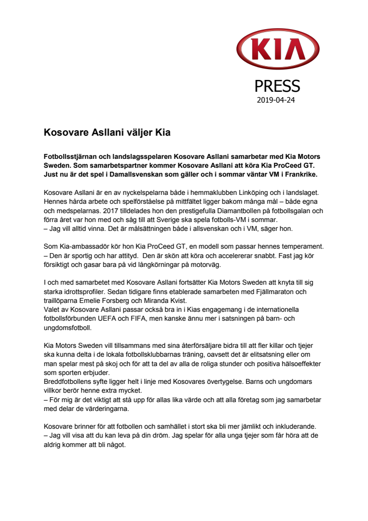 En av fotbollens stora frontfigurer, Kosovare Asllani, samarbetar med Kia Motors Sweden.