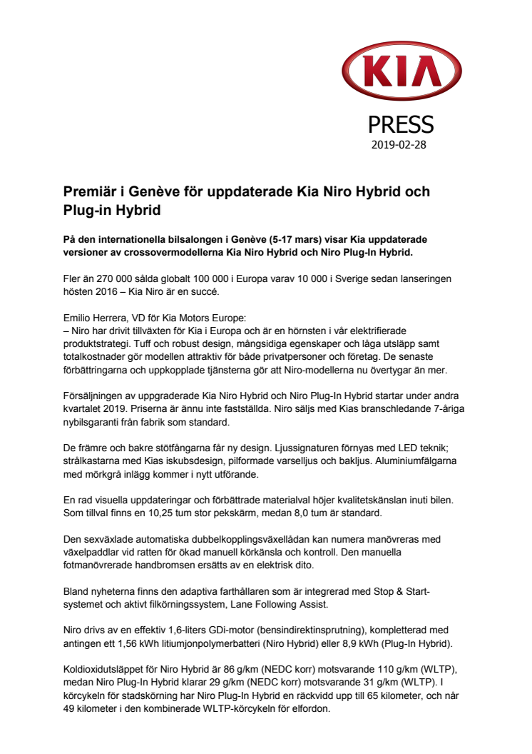 Premiär i Genève för uppdaterade Kia Niro Hybrid och Plug-in Hybrid