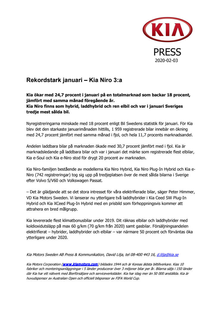 Stark januarimånad där Kia Niro-familjen går upp på tredje plats över Sveriges mest sålda bilmodeller.