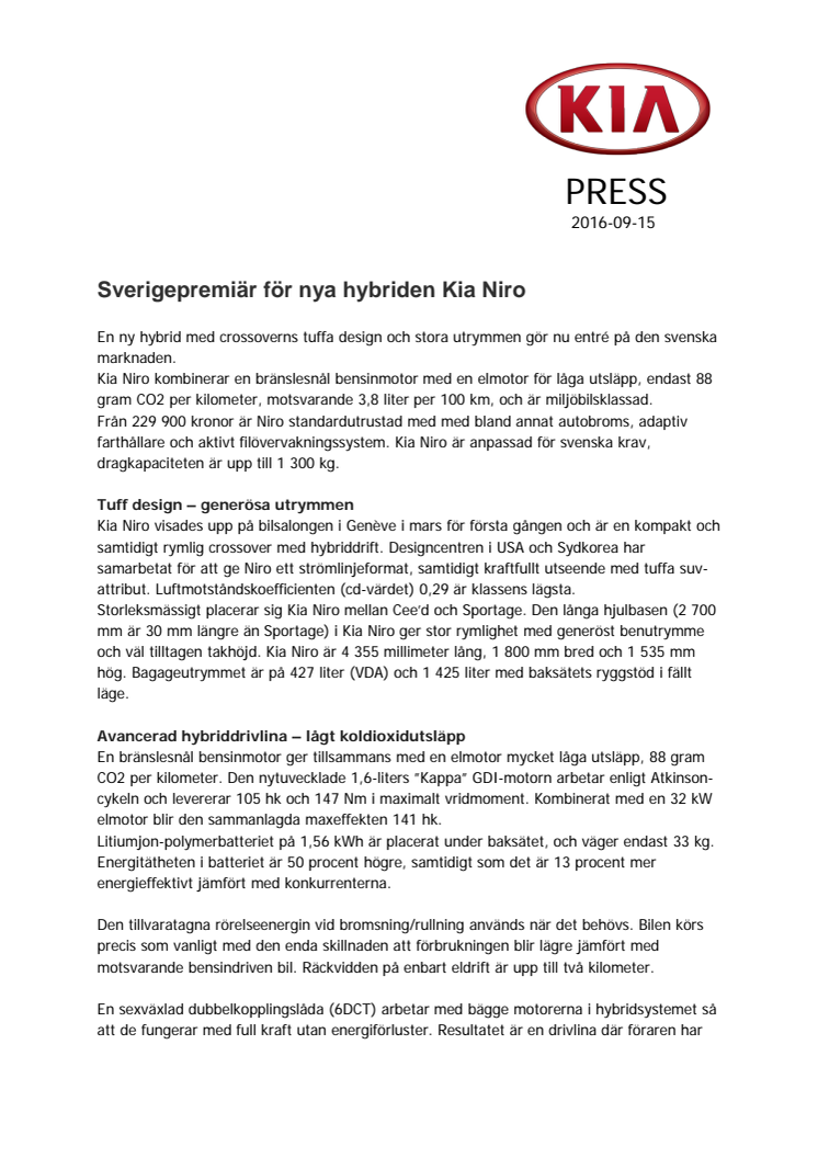 Från 229 900 kronor är Niro standardutrustad med med bland annat autobroms, adaptiv farthållare och aktivt filövervakningssystem. Kia Niro är anpassad för svenska krav, dragkapaciteten är upp till 1 300 kg.