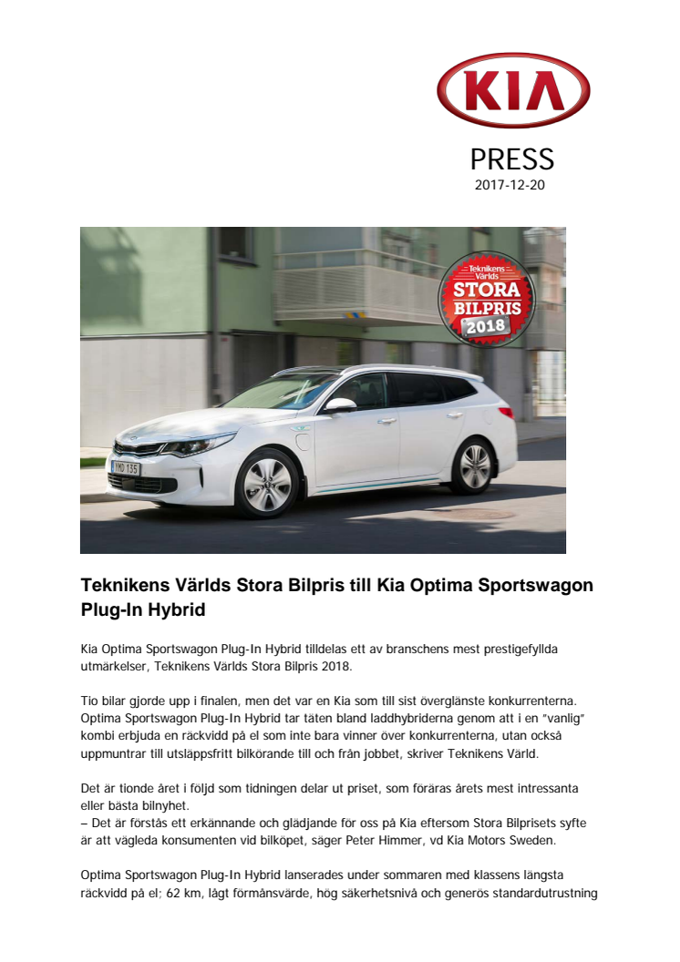 Kia Optima Sportswagon Plug-In Hybrid tilldelas ett av branschens mest prestigefyllda utmärkelser, Teknikens Världs Stora Bilpris 2018.