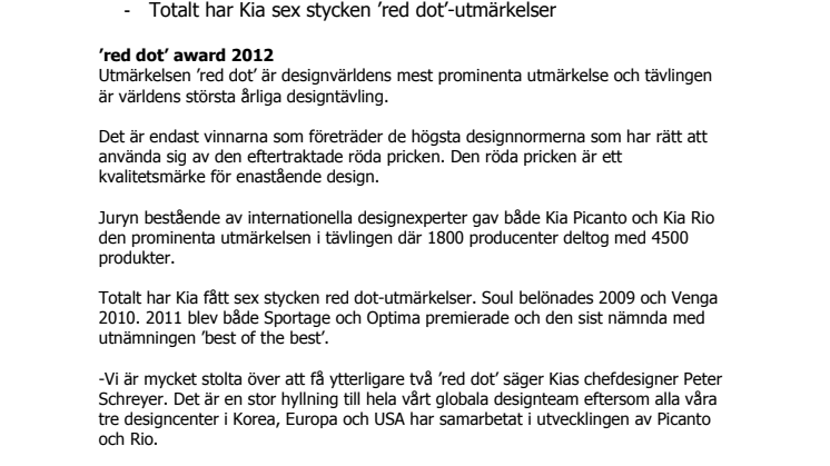 -Vi är mycket stolta över att få ytterligare två ’red dot’ säger Kias chefdesigner Peter Schreyer. Det är en stor hyllning till hela vårt globala designteam eftersom alla våra tre designcenter i Korea, Europa och USA har samarbetat i utvecklingen av Picanto och Rio.