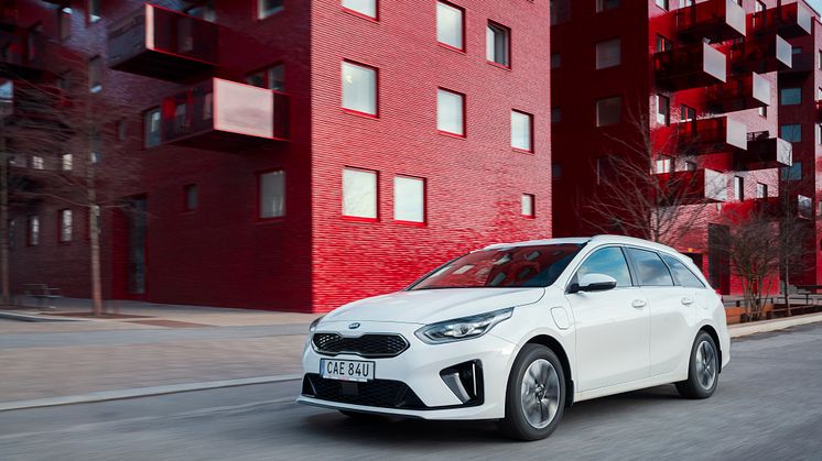 En Kia Ceed Sportswagon Plug-In Hybrid, som kan köras upp till 50 km på ren el, erbjuds från 2 995 kr/mån.
