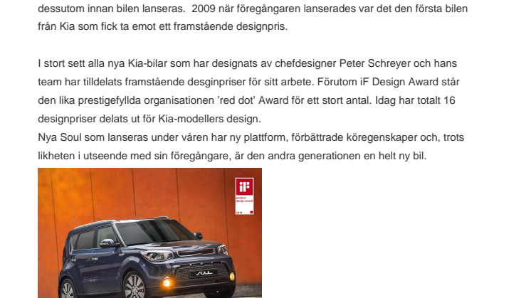 Andra generationens Kia Soul är den senaste Kia-modellen som får pris för sin design och dessutom innan bilen lanseras. 2009 när föregångaren lanserades var det den första bilen från Kia som fick ta emot ett framstående designpris.