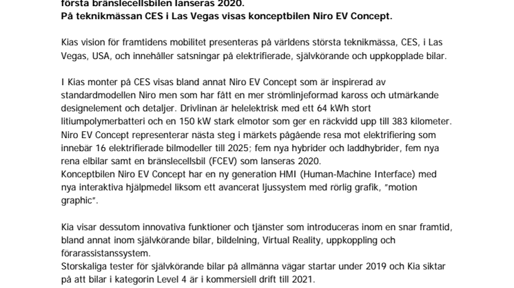 Kias vision för framtidens mobilitet presenteras på världens största teknikmässa, CES i Las Vegas, USA, och innehåller satsningar på elektrifierade, självkörande och uppkopplade bilar.