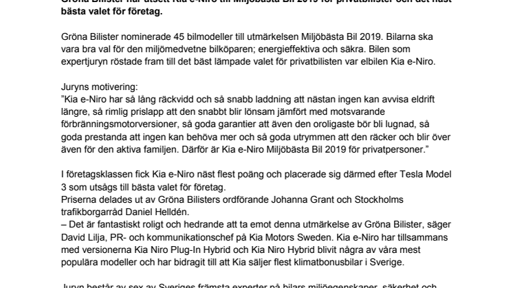Gröna Bilister nominerade 45 bilmodeller till utmärkelsen Miljöbästa Bil 2019. Bilarna ska vara bra val för den miljömedvetne bilköparen; energieffektiva och säkra. Bilen som expertjuryn röstade fram till det bäst lämpade valet för privatbilisten var elbilen Kia e-Niro.