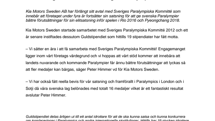 Kia Motors Sweden AB har förlängt sitt avtal med Sveriges Paralympiska Kommitté som innebär att företaget under fyra år fortsätter sin satsning för att ge svenska Paralympier bättre förutsättningar för sin elitsatsning inför spelen i Rio 2016 och Pyeongchang 2018.