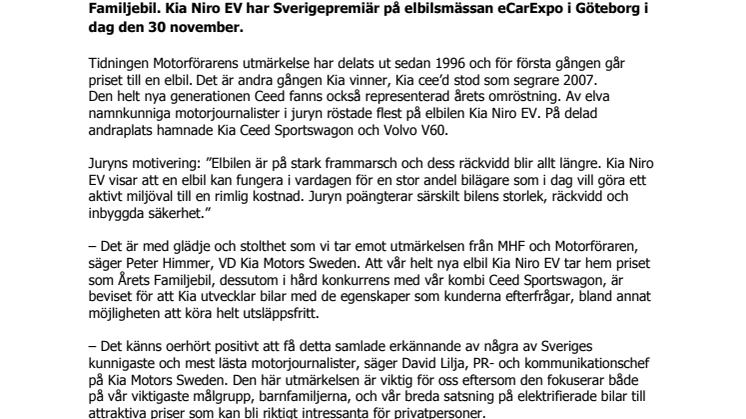 Sveriges främsta motorjournalister har utnämnt nya elbilen Kia Niro EV till Årets Familjebil 2018. Kia Niro EV har Sverigepremiär på elbilsmässan eCarExpo i Göteborg i dag den 30 november.