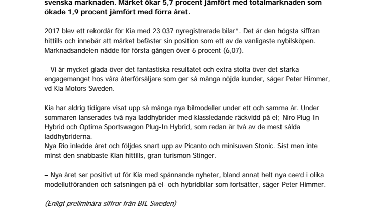 2017 blev ett rekordår för Kia med 23 037 nyregistrerade bilar*. Det är den högsta siffran hittills och innebär att märket befäster sin position som ett av de vanligaste nybilsköpen. Marknadsandelen nådde för första gången över 6 procent (6,07).