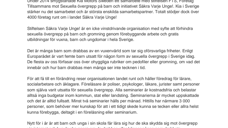 Under 2014 smygstartade Kia Motors Sweden ett samarbete med stiftelsen FTS, Företag Tillsammans mot Sexuella övergrepp på barn och initiativet Säkra Varje Unge!. Kia i Sverige stärker nu det samarbetet och är största enskilda samarbetspartner. Totalt stödjer dock över 4000 företag runt om i landet Säkra Varje Unge!