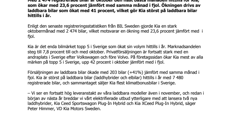 Med 2 474 registrerade bilar är oktober den näst bästa månaden hittills för Kia, som ökar med 23,6 procent jämfört med samma månad i fjol. Ökningen drivs av laddbara bilar som ökat med 41 procent, vilket gör Kia störst på laddbara bilar hittills i år.