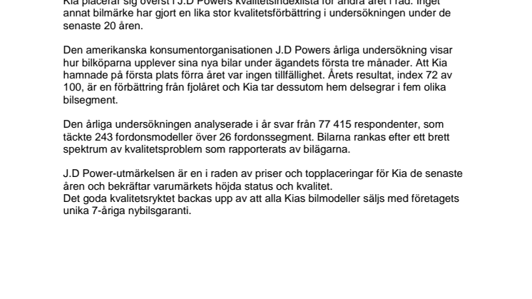 Kia placerar sig överst i J.D Powers kvalitetsindexlista för andra året i rad. Inget annat bilmärke har gjort en lika stor kvalitetsförbättring i undersökningen under de senaste 20 åren.
