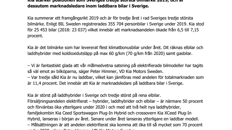 Kia stärker positionen som Sveriges tredje största bilmärke 2019, och är dessutom marknadsledare inom laddbara bilar i Sverige.