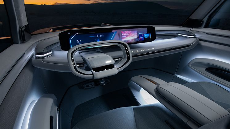 En interaktiv 27-tums ultrabred display kopplar samman den verkliga världen med den virtuella samt samlar funktionerna till multimedia, klimatreglage och komfortfinesser. Interiören andas framtid, inte minst i utformningen av ratten och dess touchskärmfunktion.