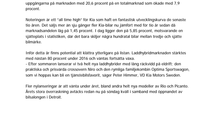 Kia Motors Sweden registrerade under fjolåret 21 788 bilar och stod för en av de största uppgångarna på marknaden med 20,6 procent på en totalmarknad som ökade med 7,9 procent.