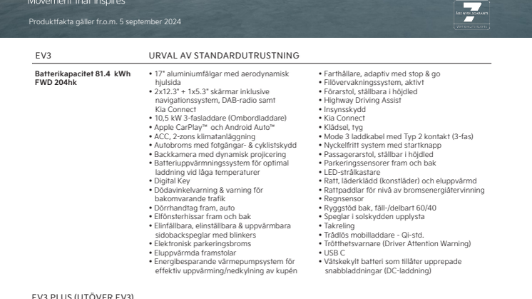 Kia Corporation (www.kia.com) är ett globalt mobilitetsvarumärke med visionen att erbjuda hållbara mobilitetslösningar. Sedan Kia grundades 1944 har företaget satt människor i rörelse. Med 52 000 anställda över hela världen, närvaro på mer än 190 marknader och produktionsanläggningar i sex länder, säljer företaget idag cirka tre miljoner fordon per år. Kia står i spetsen för populariseringen av elektrifierade fordon och elbilar och utvecklar ett växande utbud av mobilitetstjänster och uppmuntrar miljontals människor runt om i världen att utforska de bästa sätten att förflytta sig. Med företagets slogan – ”Movement that inspires” – vill Kia inspirera genom upplevelser av varumärket och genom nya innovativa produkter och tjänster.