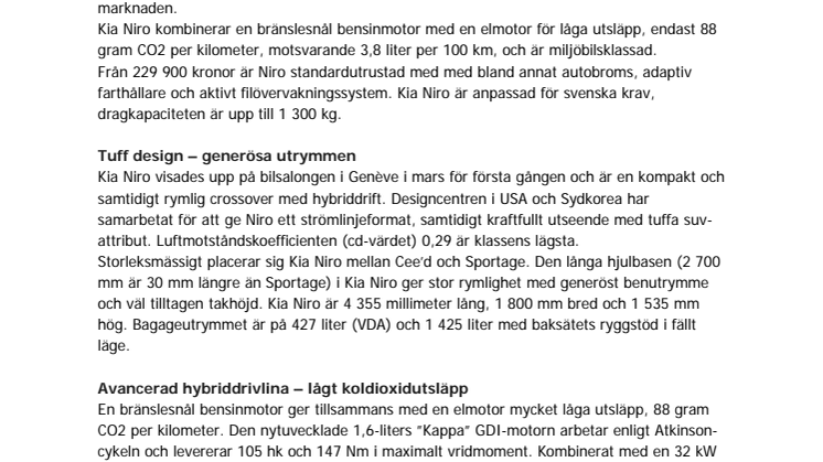 Kia Niro visades upp på bilsalongen i Genève i mars för första gången och är en kompakt och samtidigt rymlig crossover med hybriddrift. Designcentren i USA och Sydkorea har samarbetat för att ge Niro ett strömlinjeformat, samtidigt kraftfullt utseende med tuffa suv-attribut. Luftmotståndskoefficienten (cd-värdet) 0,29 är klassens lägsta. Storleksmässigt placerar sig Kia Niro mellan Cee’d och Sportage. Den långa hjulbasen (2 700 mm är 30 mm längre än Sportage) i Kia Niro ger stor rymlighet med generöst benutrymme och väl tilltagen takhöjd. Kia Niro är 4 355 millimeter lång, 1 800 mm bred och 1 535 mm hög. Bagageutrymmet är på 427 liter (VDA) och 1 425 liter med baksätets ryggstöd i fällt läge.