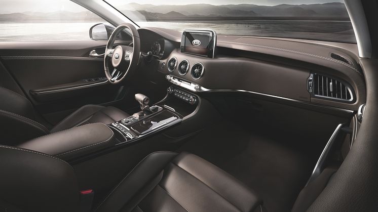 Interiört kännetecknas Kia Stinger av högklassiga materialval i en förarorienterad och logisk layout. En mix av analoga och digitala instrument, head-up display som projiceras på vindrutan i förarens synfält, och en centralt placerad pekskärm. De runda ventilationsmunstyckena i jetmotorstil och växelspaken bär inspiration från flyget.
