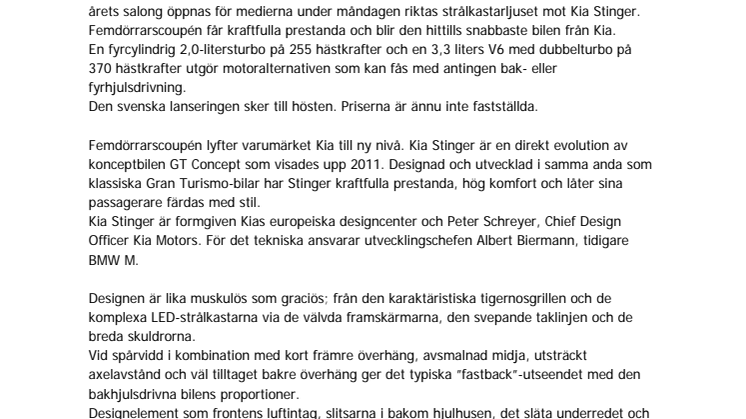 Femdörrarscoupén lyfter varumärket Kia till ny nivå. Kia Stinger är en direkt evolution av konceptbilen GT Concept som visades upp 2011. Designad och utvecklad i samma anda som klassiska Gran Turismo-bilar har Stinger kraftfulla prestanda, hög komfort och låter sina passagerare färdas med stil. Kia Stinger är formgiven Kias europeiska designcenter och Peter Schreyer, Chief Design Officer Kia Motors. För det tekniska ansvarar utvecklingschefen Albert Biermann, tidigare BMW M.