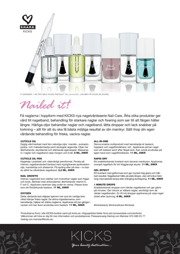Få naglarna i toppform med KICKS nya nagelvårdsserie Nail Care. Åtta produkter ger vård till nagelband, behandling för starkare naglar och fixering som ser till att färgen håller längre. Härliga oljor behandlar naglar och nagelband, lätta droppar och lack snabbar på torkning – allt för att du ska få bästa möjliga resultat av din manikyr.