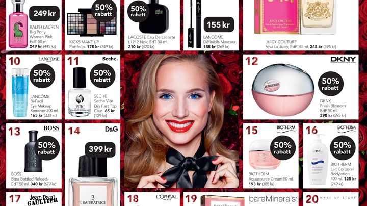 Två stora doftfavoriter som finns bakom en varsin lucka med fantastiska 50% rabatt är Juicy Couture Viva La Juicy och Jean Paul Gaultier Le Male. I andra luckor finns skönhetsfavoriter som Elizabeth Arden 8H Cream, Seche Vite Top Coat, Make Up Store Cover All Mix, DKNY Be Delicious Fresh Blossom, Biotherm Lait Coporel Body lotion och många, många fler…