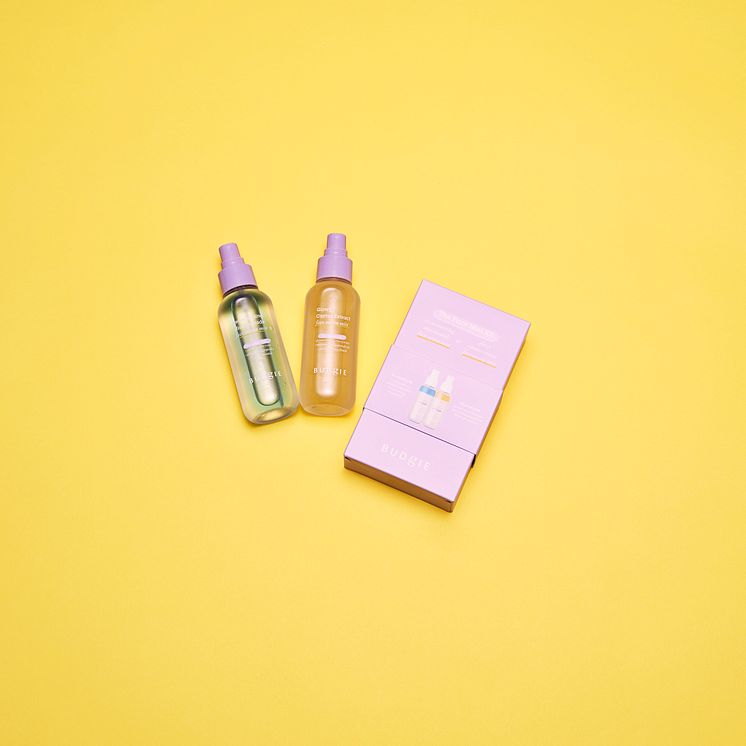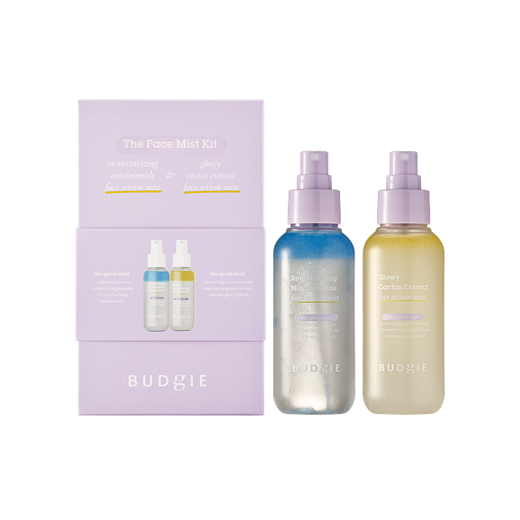 Denna gåvobox innehåller Budgies två ansiktsmistar: Glowy Cactus Extract Face Serum Mist och Retexturizing Nicinamide Face Serum Mist. Båda mistarna har en formula i två delar, där ena delen är ett serum som sedan kombineras när man skakar misten innan användning. Båda mistarna är perfekta för en extra fuktboost precis när som helst!