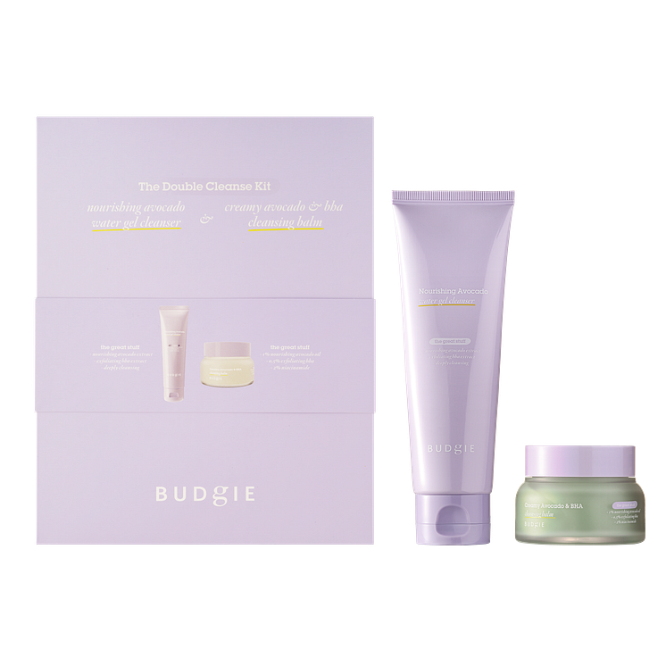 I detta gåvokit finner du Budgies två rengöringar: den vattenbaserade rengöringen Nourishing Avocado Water Gel Cleanser och den oljebaserade rengöringen Creamy Avocado & BHA Cleansing Balm.
