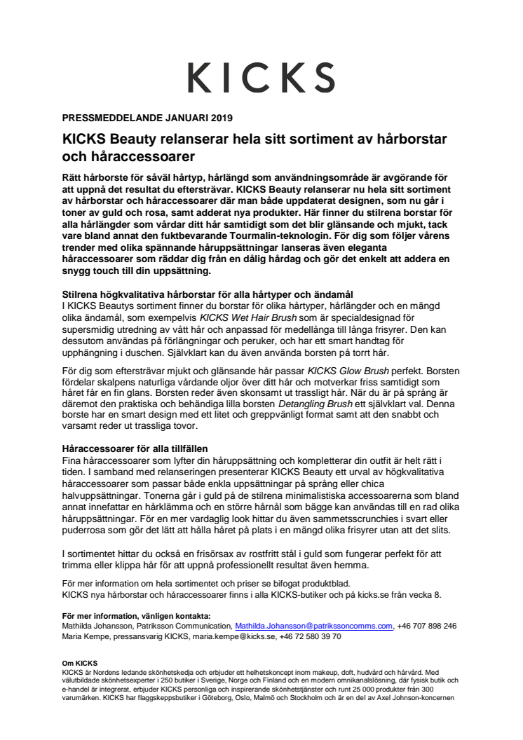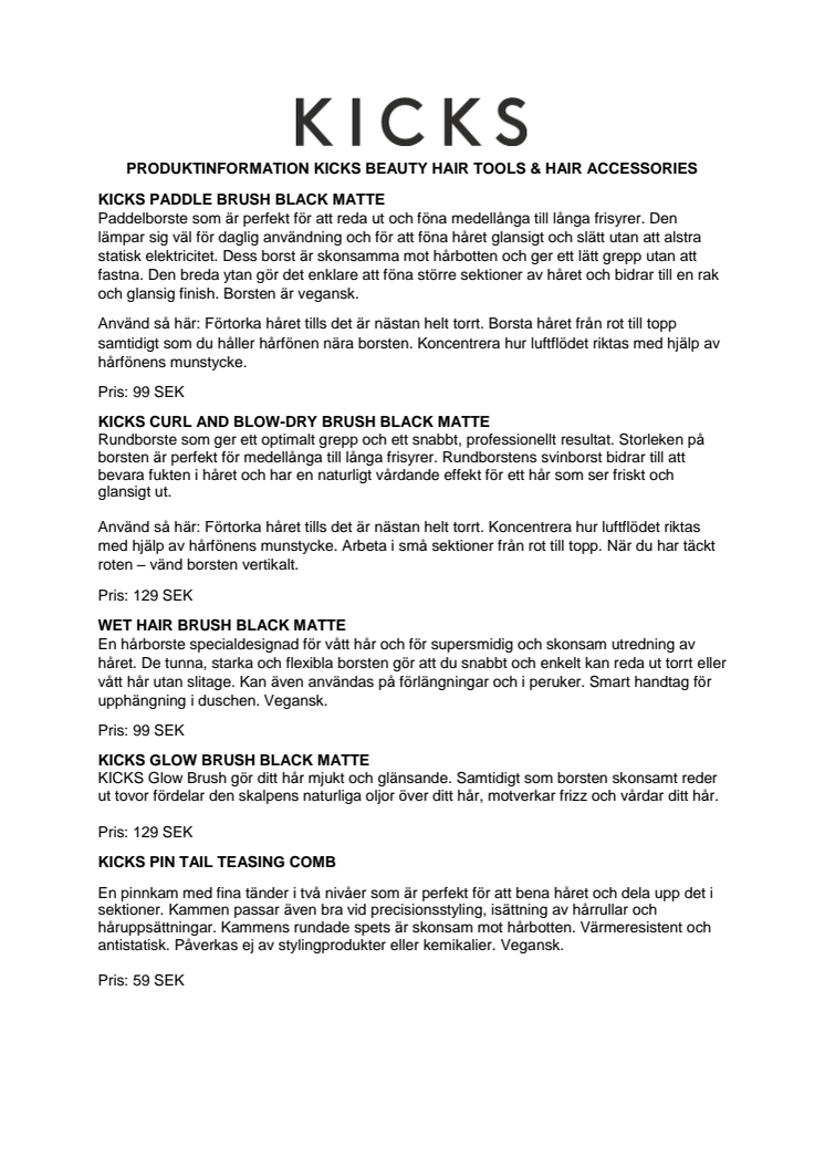 För mer information om hela sortimentet och priser se bifogat produktblad. KICKS nya hårborstar och håraccessoarer finns i alla KICKS-butiker och på kicks.se från vecka 8.