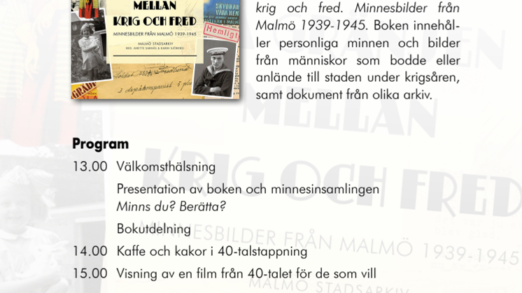Inbjudan till boksläpp på Malmö stadsarkiv: På gränsen mellan krig och fred. Minnesbilder från Malmö 1939-1945