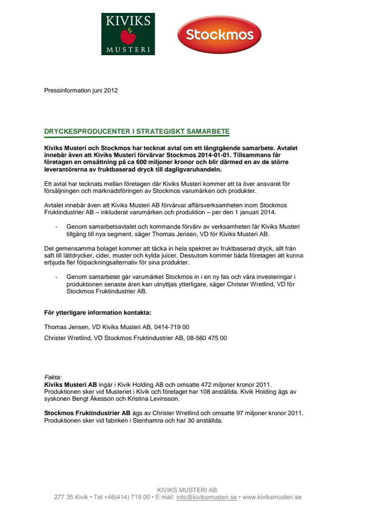 innebär även att Kiviks Musteri förvärvar Stockmos 2014-01-01. Tillsammans får