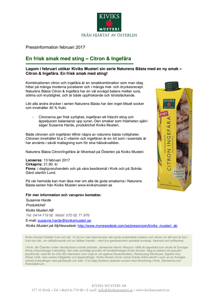 Lagom i februari utökar Kiviks Musteri sin serie Naturens Bästa med en ny smak – Citron & Ingefära. En frisk smak med sting!