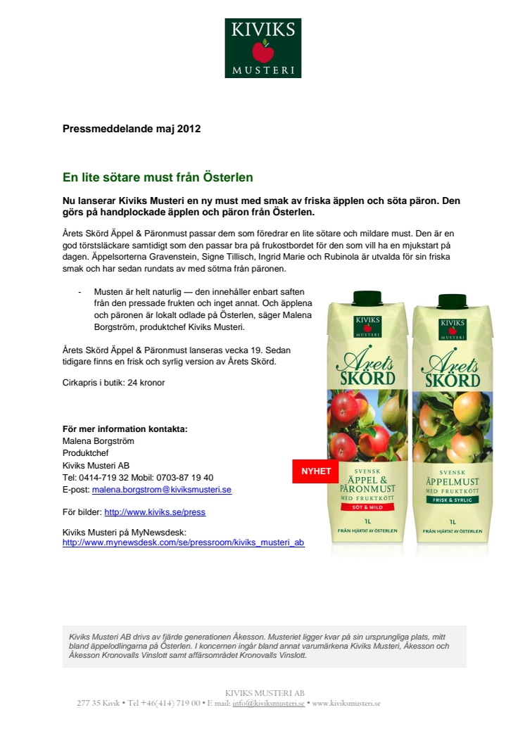 Nu lanserar Kiviks Musteri en ny must med smak av friska äpplen och söta päron. Den görs på handplockade äpplen och päron från Österlen.