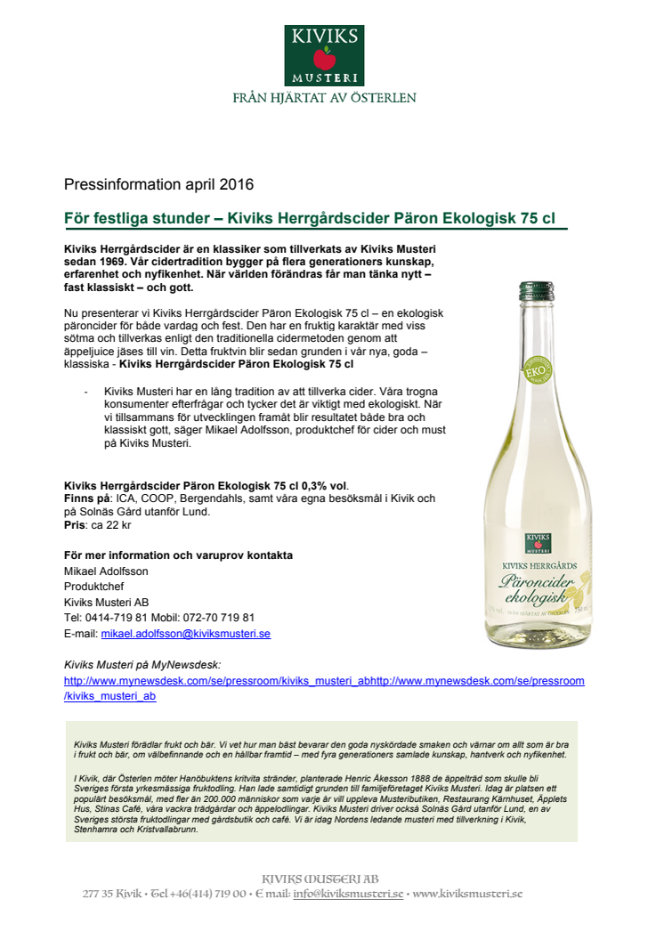 För festliga stunder – Kiviks Herrgårdscider Päron Ekologisk 75 cl