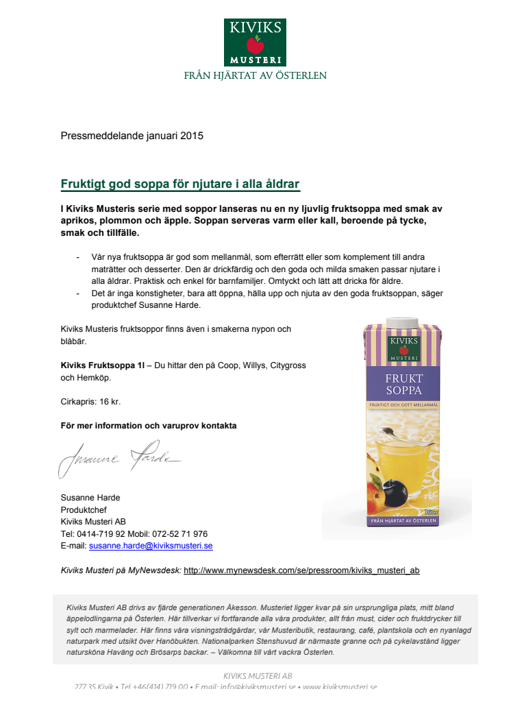 I Kiviks Musteris serie med soppor lanseras nu en ny ljuvlig fruktsoppa med smak av aprikos, plommon och äpple. Soppan serveras varm eller kall, beroende på tycke, smak och tillfälle.