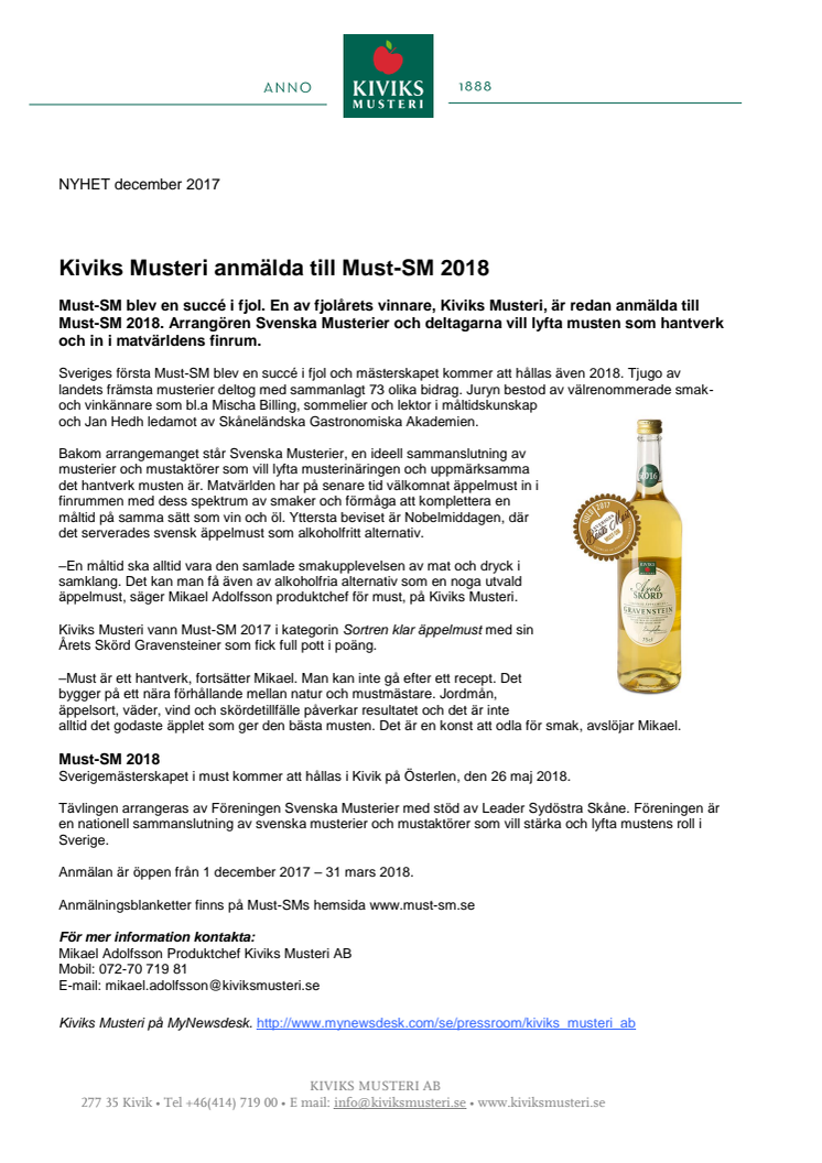 Must-SM blev en succé 2017. En av vinnarna, Kiviks Musteri, är redan anmälda till Must-SM 2018. Arrangören Svenska Musterier och deltagarna vill lyfta musten som hantverk och in i matvärldens finrum.