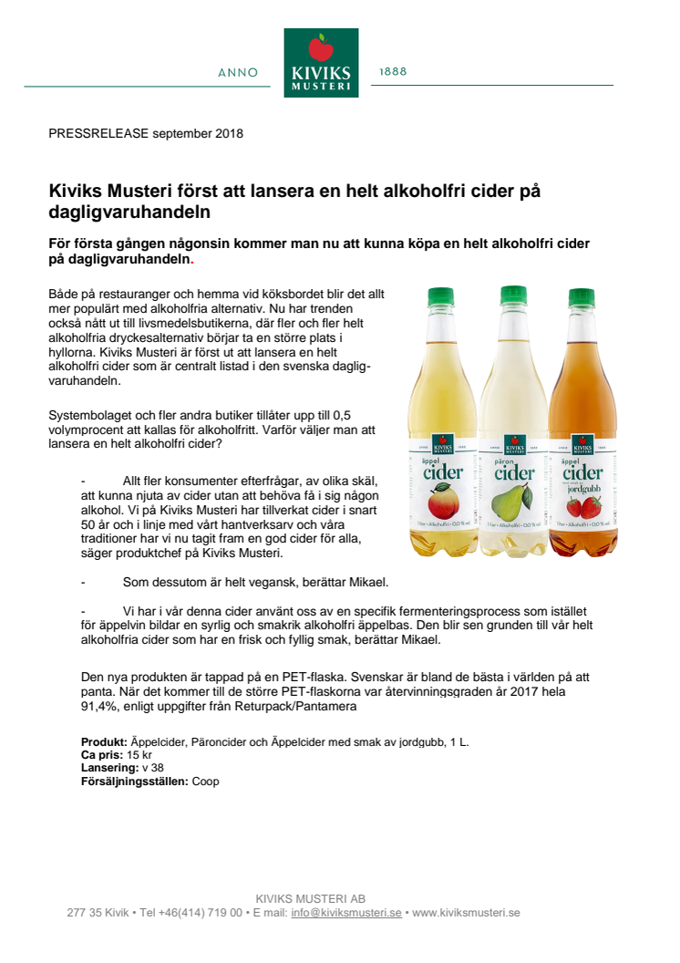 Kiviks Musteri först att lansera en helt alkoholfri cider på dagligvaruhandeln