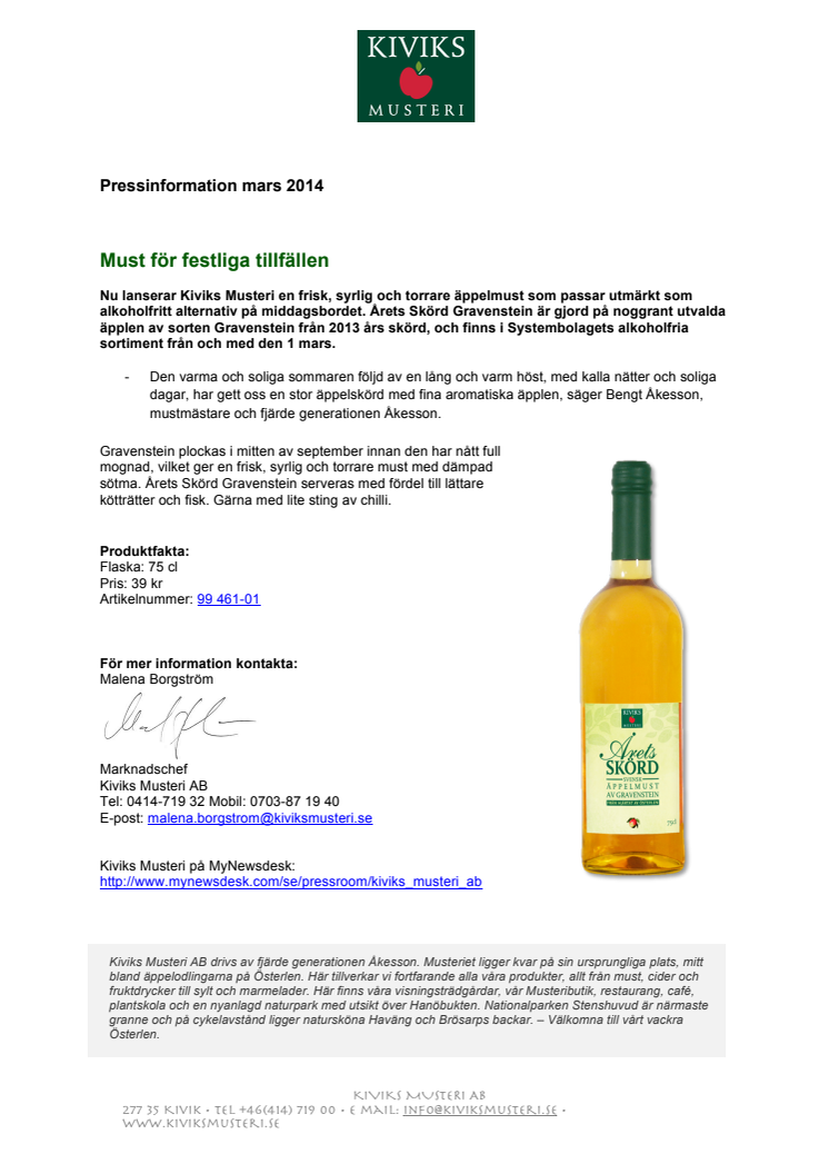 Nu lanserar Kiviks Musteri en frisk, syrlig och torrare äppelmust som passar utmärkt som alkoholfritt alternativ på middagsbordet. Årets Skörd Gravenstein är gjord på noggrant utvalda äpplen av sorten Gravenstein från 2013 års skörd, och finns i Systembolagets alkoholfria sortiment från och med den 1 mars.