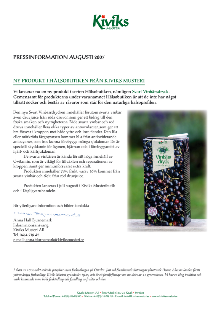 Vi lanserar nu en ny produkt i serien Hälsobutiken, nämligen Svart Vinbärsdryck. Gemensamt för produkterna under varunamnet Hälsobutiken är att de inte har något tillsatt socker och består av råvaror som står för den naturliga hälsoprofilen.